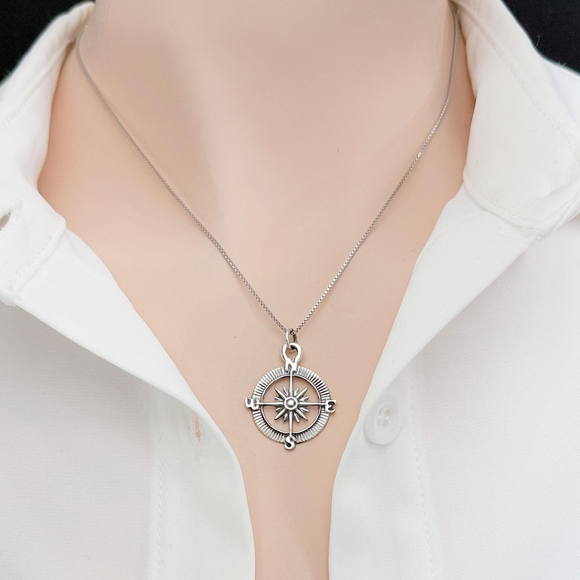 Sterling Silver Compass Necklace, Oxidized North Star Pendant, Graduation Gift Jewelry for Women